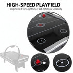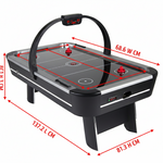 Introducing our impressive 7ft Air Hockey Table, designed for exhilarating gameplay. With dimensions of 213.4x121.9x76.2cm, this table features a robust construction, including a 3+12+3mm MDF playing field, 36mm MDF rails, and 5/16" leg levelers for stability. The set comes complete with: